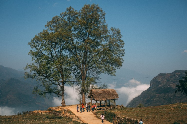 Đây là một góc săn ảnh quen thuộc của nhiều tay máy khi đến Y Tý. Điểm đến này thường xuất hiện những biển mây bồng bềnh trên trên lưng chừng núi với 2 gốc cây cổ thụ, là nơi những đứa trẻ Hà Nhì thường rủ nhau đến chơi mỗi ngày.
