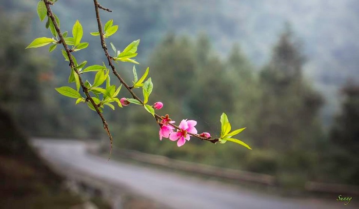 Men theo những cung đường quanh co uốn lượn trên con đường hạnh phúc, xe đưa chúng tôi đến Cao nguyên đá Đồng Văn. Đất trời Hà Giang đang vào xuân trên khắp các nẻo đường từ Quản Bạ đến yên Minh, Đồng Văn, Mèo Vạc đâu đâu cũng ngập tràn trong sắc hoa đào hồng thắm. Hà Giang trong chiếc áo xanh thắm của mùa xuân khoe những lộc non căng tròn đầy sức sống, tô điểm thêm bởi vẻ đẹp rực rỡ của những bông hoa đào, hoa mận đang khoe sắc.