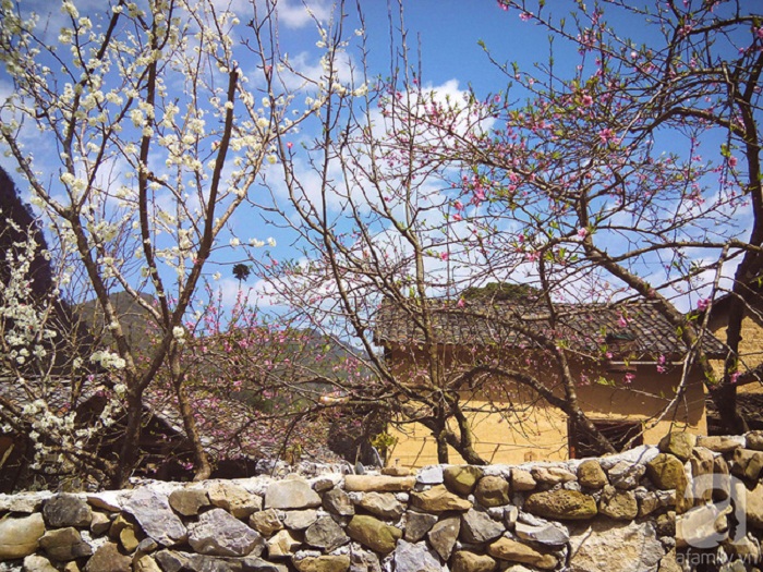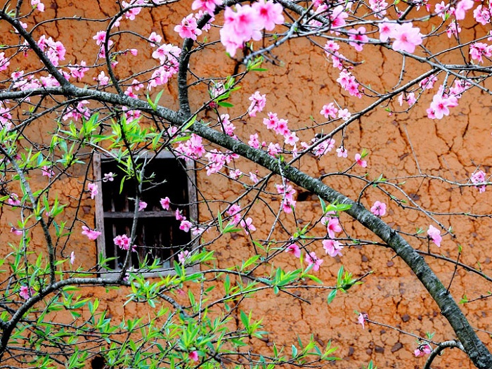 Hoa đào tô điểm cho các bức từng bằng đất trở nên thơ mộng hơn