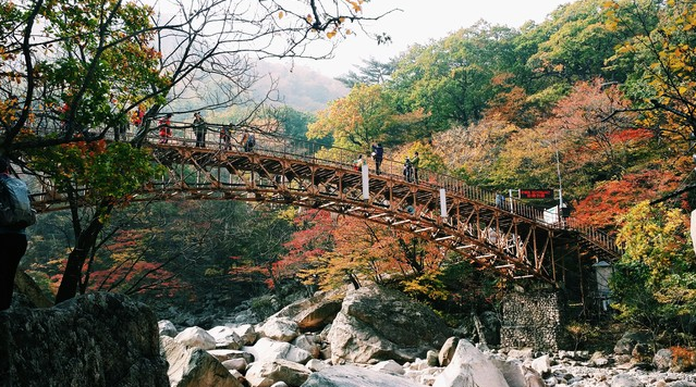 Núi Seoraksan được cho là nơi ngắm lá vàng vào mùa thu đẹp nhất Hàn Quốc, rất nhiều du khách tìm đến Seoraksan vào cả bốn mùa trong năm để chiêm ngưỡng vẻ đẹp mê hoặc, kiêu kỳ của những ngon núi, những thung lũng, thác nước của Seoraksan. Để chinh phục Seoraksan bạn có thể chọn hình thức leo núi hoặc đi cáp treo, Nhiều đường mòn trên núi, từ dễ đến rất khó đi, cho phép những người đi bộ đường dài và những người leo núi ngắm núi non, thác nước, đời sống thực vật và động vật đa dạng, rừng rậm dày đặc và kể cả Biển Đông . Mùa thu là thời điểm đặc biệt tuyệt đẹp, với thời tiết dễ chịu và khung cảnh rực rỡ khi lá của rừng gỗ cứng đổi sắc sang vàng và đỏ. Nếu bạn là người yêu thích du lịch mạo hiểm thì chinh phục Seoraksan chắc chắn sẽ là một trong những trải nghiệm tuyệt vời trong chuyến du lịch Hàn Quốc của mình. Để chinh phục Seoraksan bạn có rất nhiều cung đường để chọn lựa, nhưng để có thể cảm nhận trọn vẹn được vẻ đẹp của Seoraksan vào mùa thu thì bạn nên chọn những tuyến đường sau: chùa Sinheungsa, thung lũng Cheonbuldong đi qua Biseondae và khu vực Jujeongol bắt đầutừ suối nước khoáng Osaek .