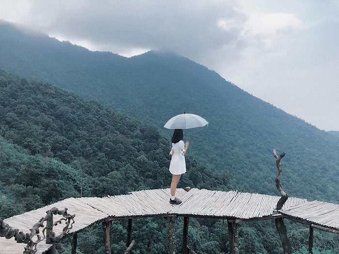 Đặc biệt là điểm đến mới siêu đáng yêu cho các bạn trẻ tha hồ chụp ảnh check in sống ảo - cầu mây Tam Đảo - studio ngoài trời làm mưa làm gió nơi đây. Cầu Mây được làm bằng tre nứa đan vào nhau. Phía dưới được chống bằng hệ thống bệ đỡ bằng sắt, chạy dọc sườn núi. Từ cầu mây nhìn xuống, thấy biết bao màu xanh cây lá. Cảm giác bình yên len lỏi trong mỗi người.