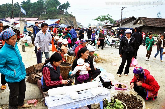 Trước mắt tôi là hình ảnh những chàng trai, cô gái miền núi xúng xính trong những bộ áo mới, những bộ váy thổ cẩm nhiều màu sắc với hoa văn tinh tế đặc trưng của mỗi dân tộc tụ họp tại nơi đây. Họ đến chợ để chơi, để mua bán, để trao đổi tâm tư tình cảm. Họ nói bằng những thứ tiếng khác nhau, tiếng Mông, tiếng Tày, tiếng Bố y và thỉnh thoảng xen lẫn những tiếng Kinh. Họ cười nói chuyện trò râm ran làm cho không khí trở nên sôi nổi, xua tan cái lạnh giá, cái vắng lặng yên bình của phố núi.