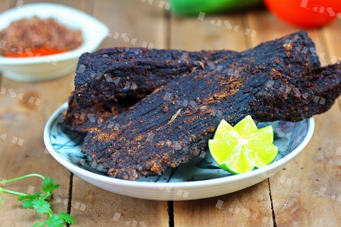 Thịt trâu gác bếp là món ăn thường nhật trong các bữa cơm của người Thái đen. Được làm từ bắp của những chú trâu, bò nhà thả rông trên các sườn núi, nên thịt trâu gác bếp có vị ngon khác hẳn với vị của thịt trâu thường thấy. Cách chế biến ở đây cũng theo công thức bí truyền, các loại gia vị đều đặc trưng cho núi rừng Tây Bắc, đặc biệt là mắc khén – một loại hạt tiêu rừng của đồng bào dân tộc thiểu số vùng cao. Khi chế biến, người ta lóc các thớ thịt ra theo chiều dọc, ướp các loại gia vị rồi đem hun bằng khói của than củi; nên khi chín các loại gia vị này vẫn còn nguyên trên từng thanh thịt. Miếng thịt tuy khô nhưng vẫn giữ được mùi vị và độ ngọt đậm đà.