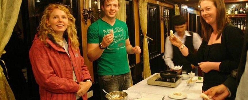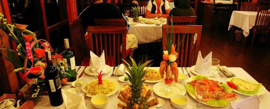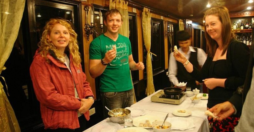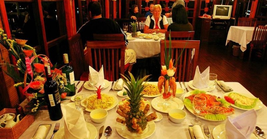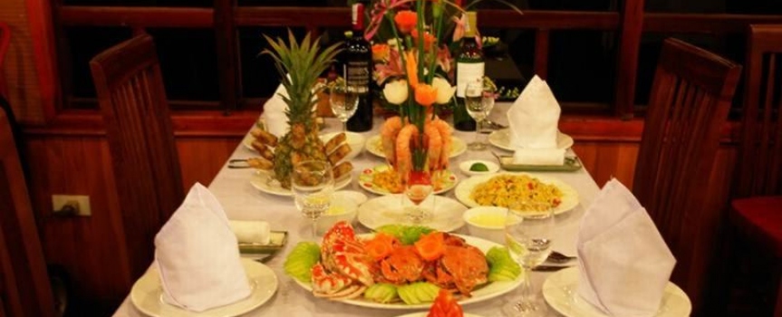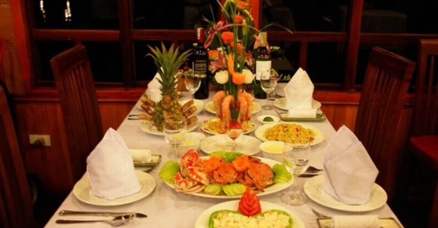 13h15: Quý khách dùng bữa trưa trên tàu với những món ăn được chế biến từ hải sản tươi sống