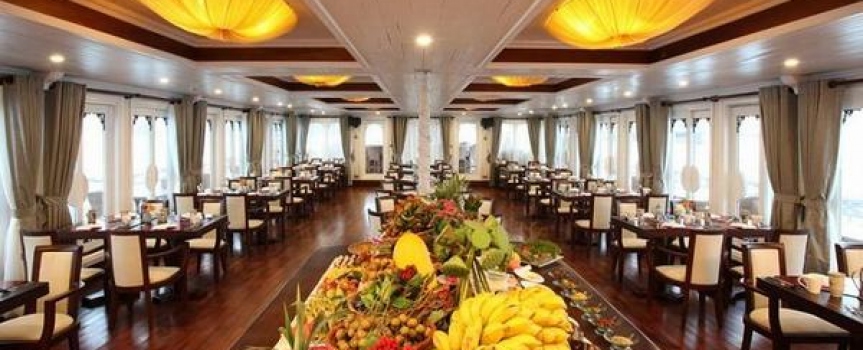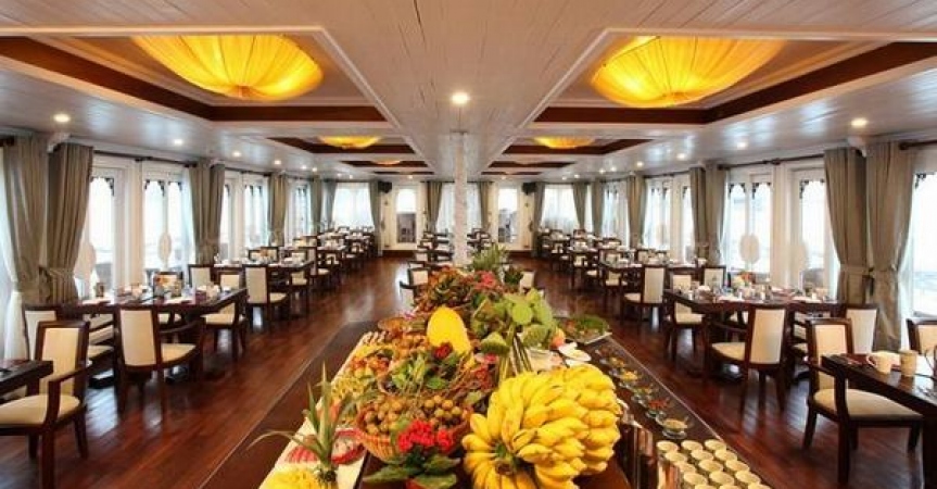 12:00 Quý khách thưởng thức bữa trưa trên nhà hàng trong khi tàu hướng về Vịnh Lan Hạ và Đảo Cát Bà