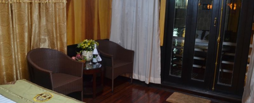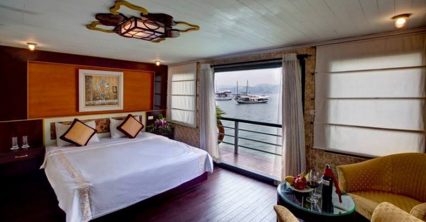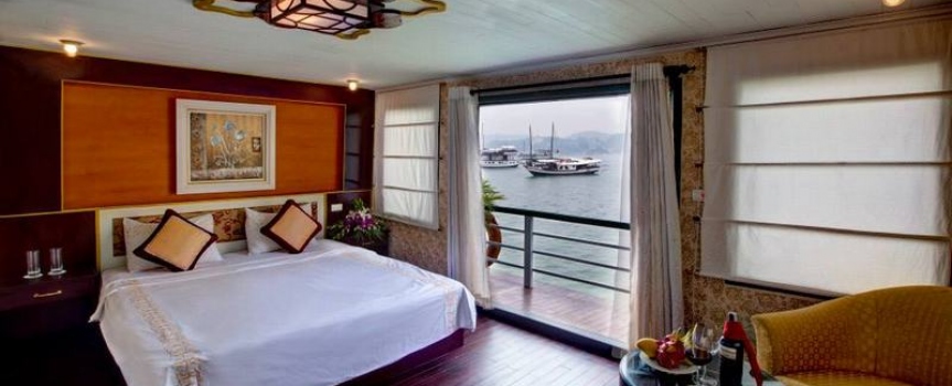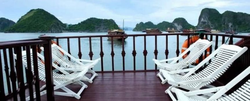 12h00: Đến Hạ Long, Quý khách lên tàu, thưởng thức cốc tai chào mừng khách trong khi nghe giới thiệu về lịch trình và làm thủ tục nhận phòng.