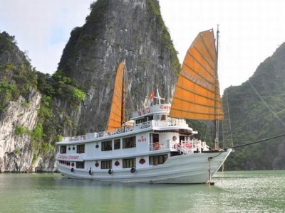 13h30: Du thuyền thăm vịnh, tham quan hòn Đỉnh Hương, hòn Gà Chọi một biểu tượng của Hạ Long, hòn Chó đá, thăm hang Sửng Sốt. Sau khi thăm hang quý khách trở lại tàu và tắm biển từ tàu tại khu vực dừng nghỉ đêm. Qúy khách có thể tham gia vào lớp học nấu ăn để học nấu một vài món ăn Việt đơn giản, thưởng thức một ly rượu miễn phí.