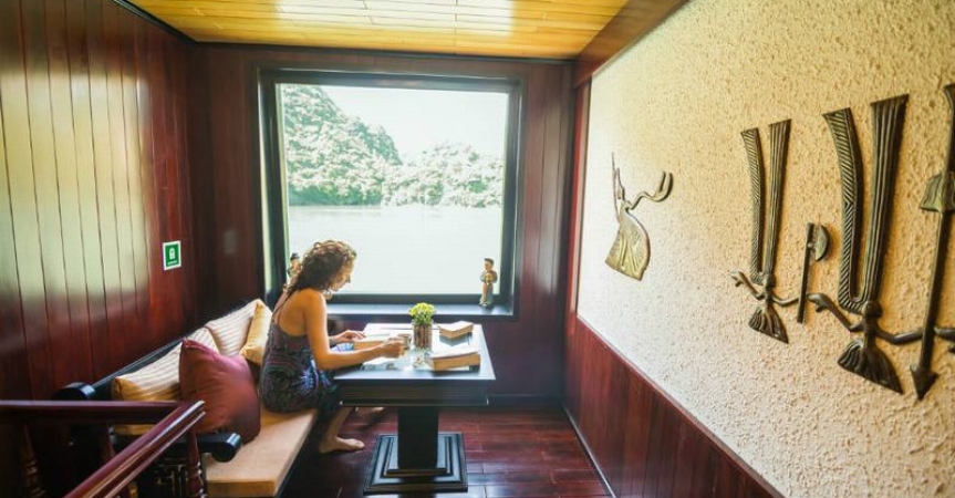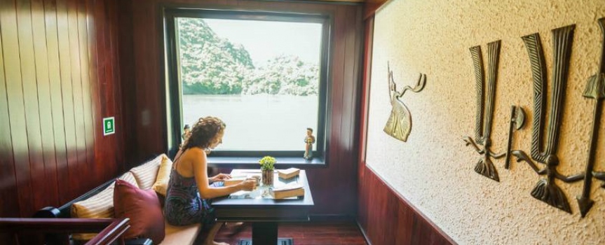 Thưởng thức phong cảnh buổi sáng của vịnh bằng cách ngồi nhâm nhi ly trà hoặc cà phê, ngắm cảnh vịnh vào buổi sáng thật yên bình. Ngồi ngay mạn tàu trước, thật thích thú trước cảnh đẹp hùng vĩ mà nên thơ với những núi đá vôi nhô cao từ mặt nước trong như thuỷ tinh. Không gian tĩnh mịch lạ thường.