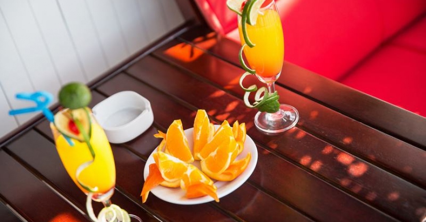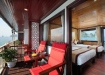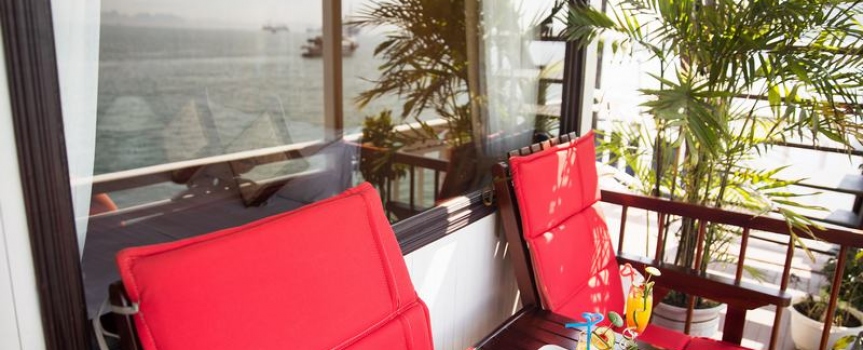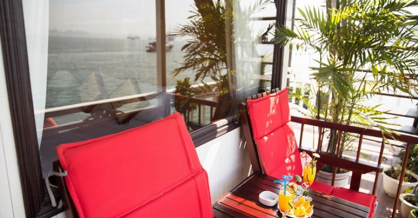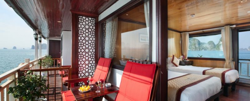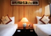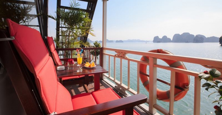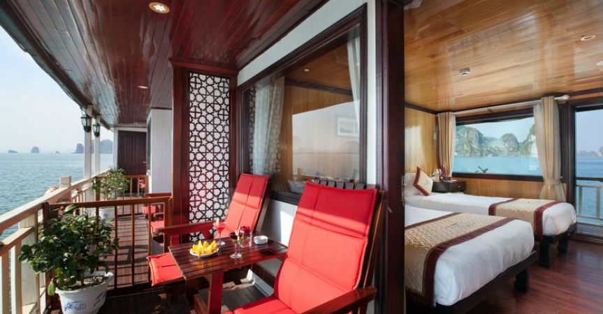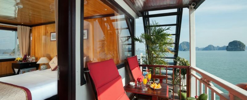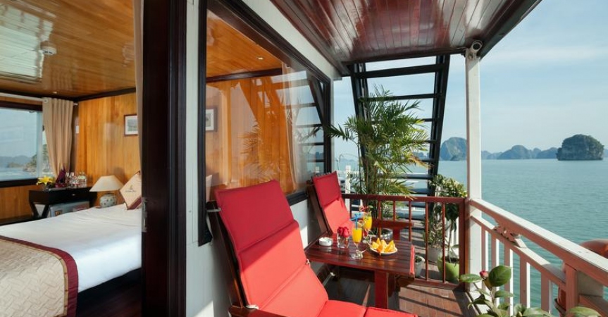 12:45: Quý khách nhận phòng, thưởng thức ly hoa quả chào mừng trong khi nghe Thuyền trưởng giới thiệu về chương trình và các quy định an toàn trên tàu