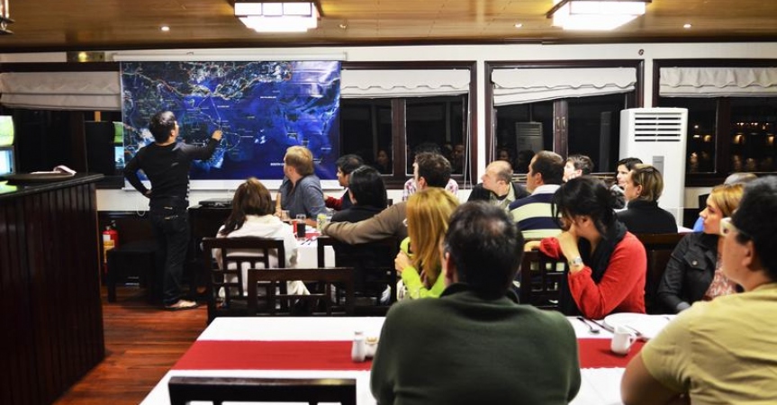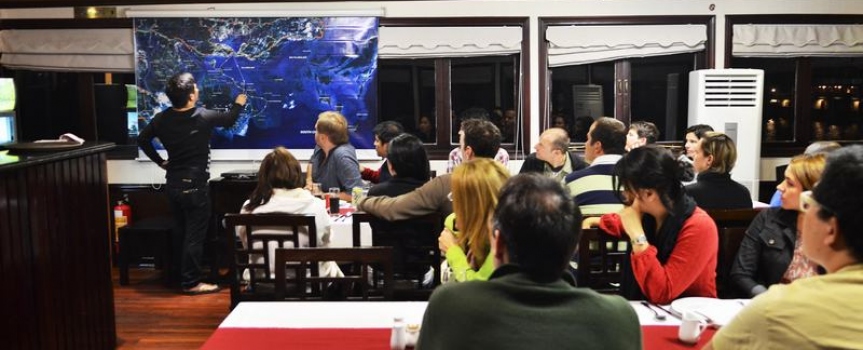 12:45: Quý khách nhận phòng, thưởng thức ly hoa quả chào mừng trong khi nghe Thuyền trưởng giới thiệu về chương trình và các quy định an toàn trên tàu.