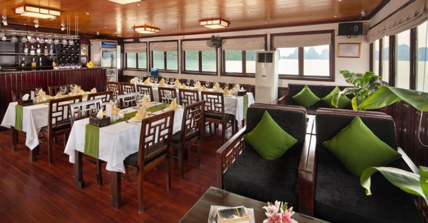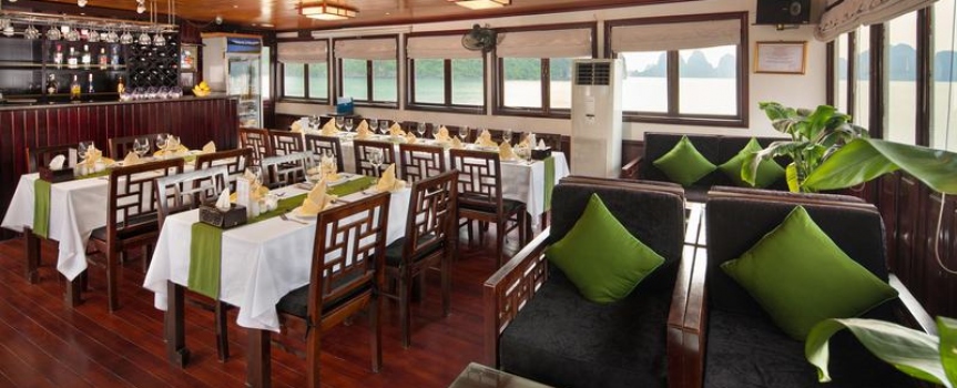 Nhà hàng của du thuyền Garden Bay Premium ở tầng 3, với bài trí gọn gàng, thanh tao, nổi tiếng với những món ăn Âu và những món truyền thống Việt Nam. Ngồi tại bất cứ vị trí nào du khách cũng có thể nhìn ngắm trọn vẹn cảnh biển và những núi đá vôi kỳ bí. Quầy bar ngay bên trong nhà hàng mang đến cho du khách những lựa chọn đồ uống tuyệt vời với giá cả hợp lý.
