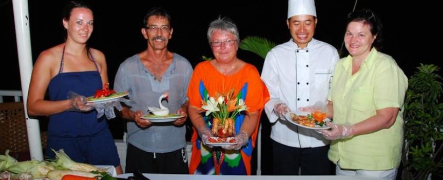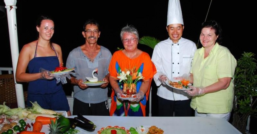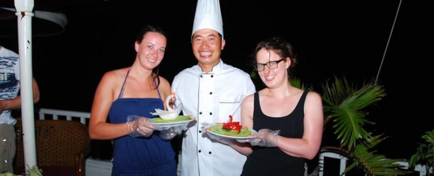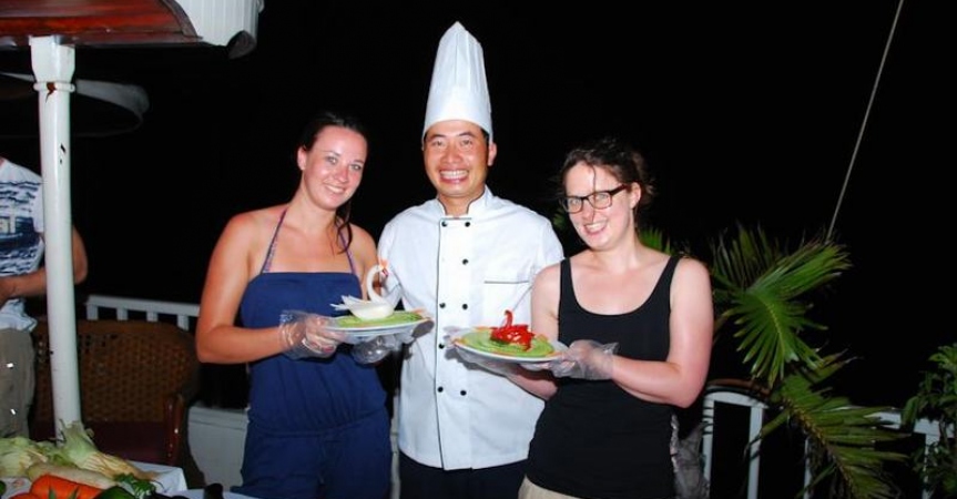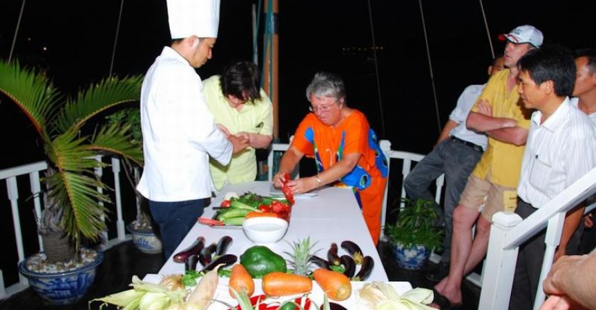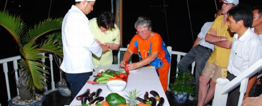 18.00 Lớp học nấu ăn được tổ chức trên sundeck (boong tàu), đây là dịp quý khách được trổ tài nấu ăn với món ăn truyền thống Việt Nam (nem rán).