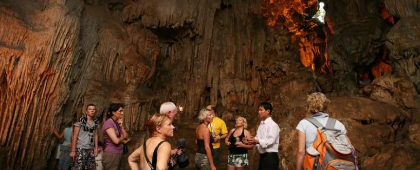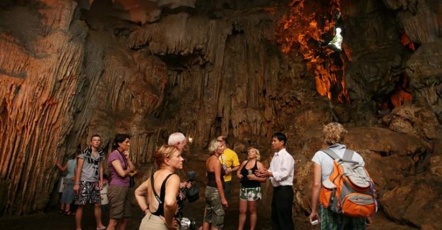 1.00 pm: Ăn trưa trên du thuyền trong lúc du thuyền bắt đầu đưa quý khách đi thăm quan vịnh. Quý khách có thể dễ dàng thấy hòn Đỉnh Hương, hòn Gà Chọi, hòn Ngón Tay. Sau đó quý khách khám phá hang Sửng Sốt, 1 trong những hang động lớn nhất và đẹp nhất tại vịnh Hạ Long. Buổi chiều, quý khách sẽ có thời gian tắm biển tại bãi Titop (hoặc Soi Sim) hoặc leo núi lên đỉnh núi Titop để ngắm nhìn vẻ đẹp của vịnh Hạ Long.