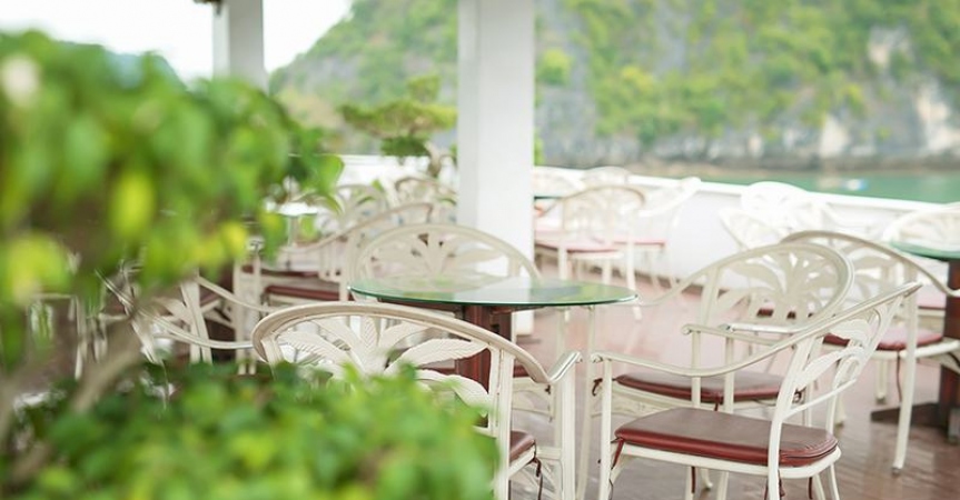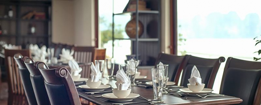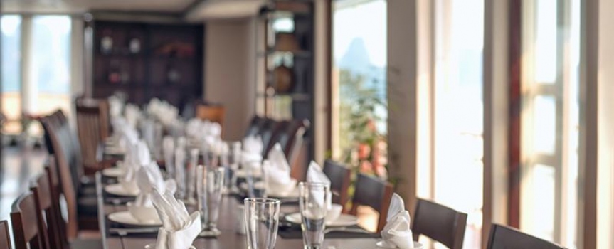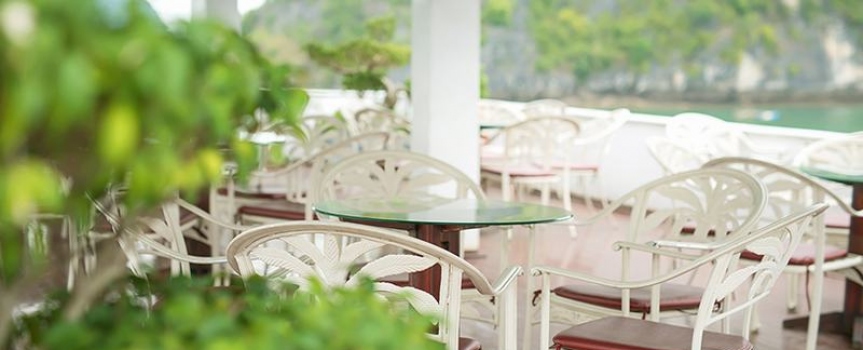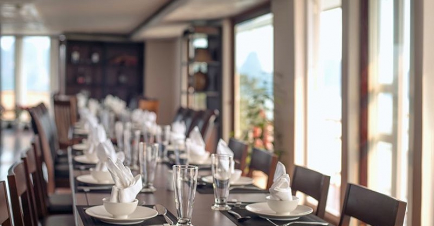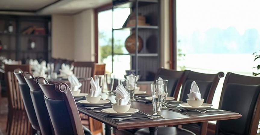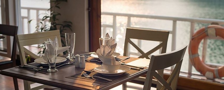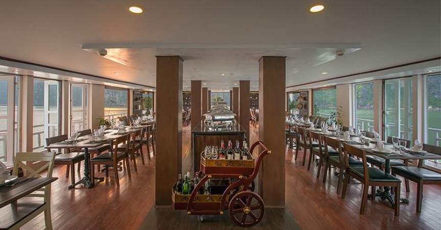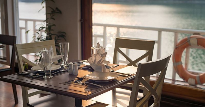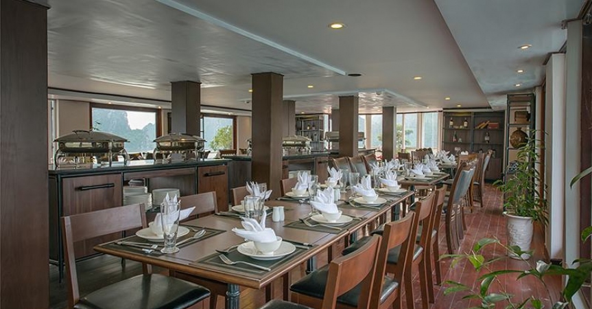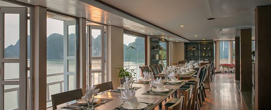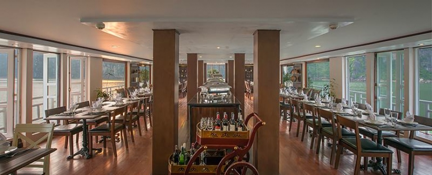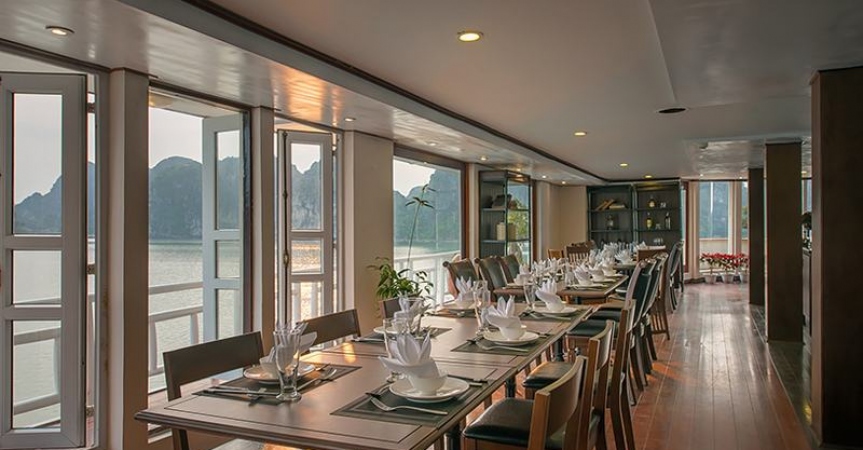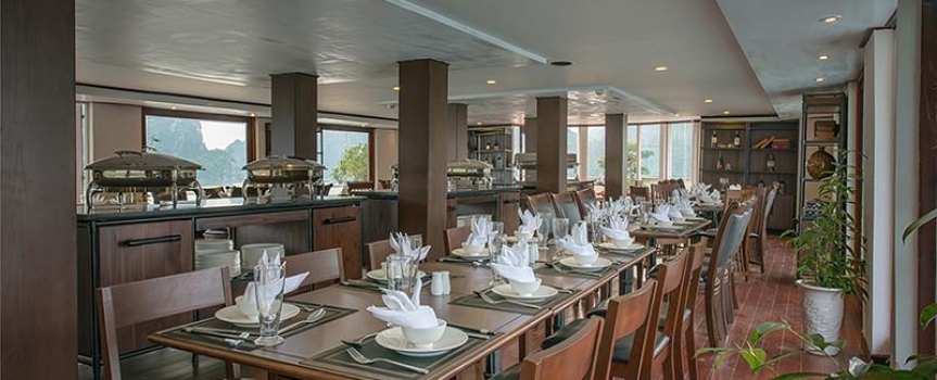 Du thuyền La Vela Classic có hệ thống nhà hàng và quầy bar rộng rãi, sang trọng. Cách bài trí tạo cảm giác thoải mái và thích thú cho mỗi bữa ăn, du khách có thể vừa thưởng thức món ăn vừa chiêm ngưỡng cảnh sắc Hạ Long tuyệt đẹp qua những khung cửa sổ.