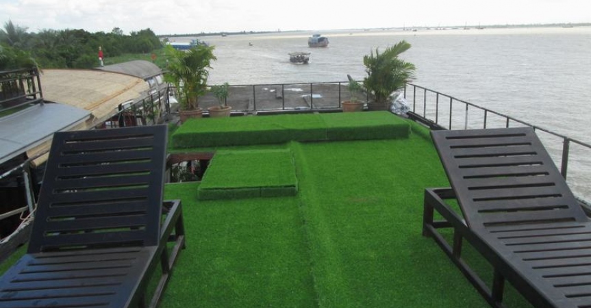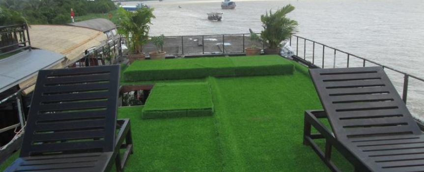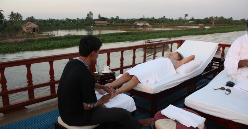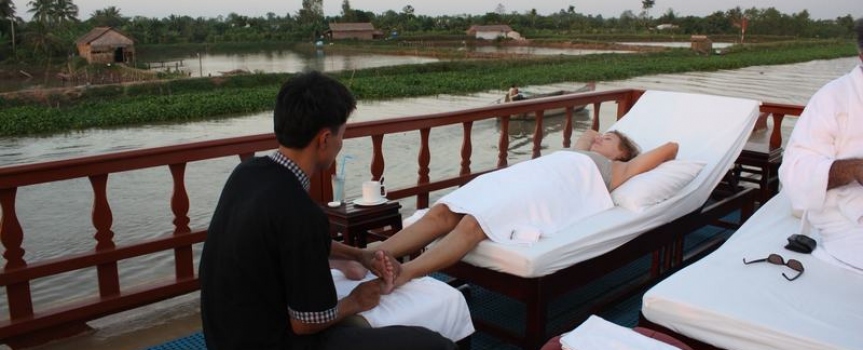 Khu vực Sundeck của Le Cochinchine mang lại một trải nghiệm hoàn hảo trong không gian rộng rãi, thoáng mát để du khách có thể thoải mái chiêm ngưỡng cảnh quan tuyệt đẹp dọc bờ sông Mekong, cũng là nơi du khách thư giãn và tận hưởng dịch vụ massge tuyệt vời.