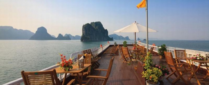 17h30: Thưởng thức bữa tiệc hoàng hôn với rượu vang và hoa quả trên mui thuyền
