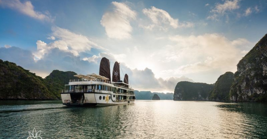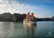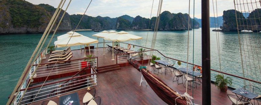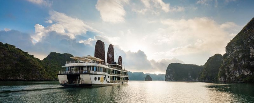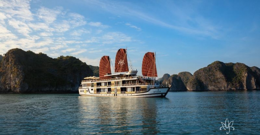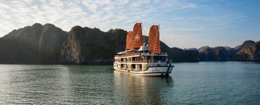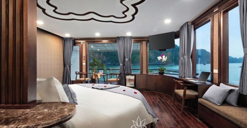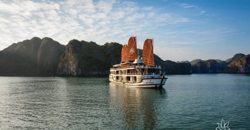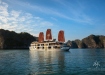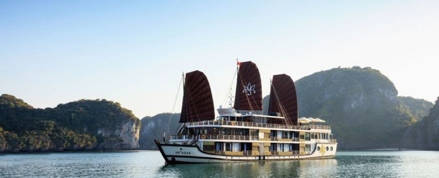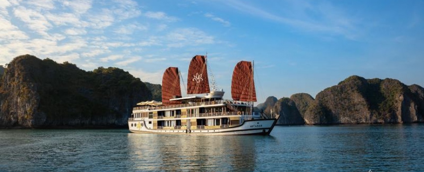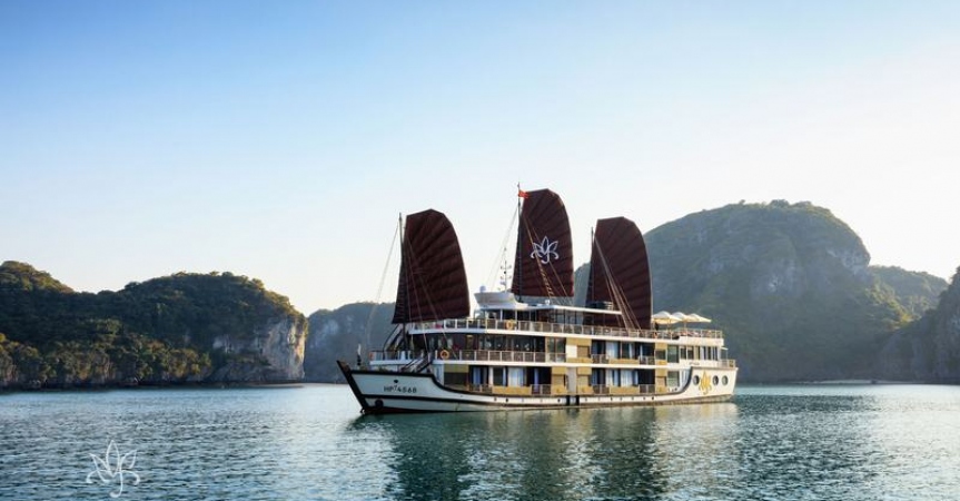 12h15: Quý khách lên tàu và làm thủ tục nhận phòng, thưởng thức bữa tiệc chào mừng; nghe thủy thủ và quản lý giới thiệu về tàu và hướng dẫn các quy tắc an toàn khi neo đậu tại phía Nam của vịnh Hạ Long, một trong “7 kì quan thiên nhiên mới” của thế giới. Vịnh Hạ Long vẫn luôn giữ được nét văn hóa từ hàng trăm năm qua, cùng nét đẹp qua nhiều thế kỉ với những vùng biển tuyệt đẹp và hàng trăm ngàn đảo đá ấn tượng.