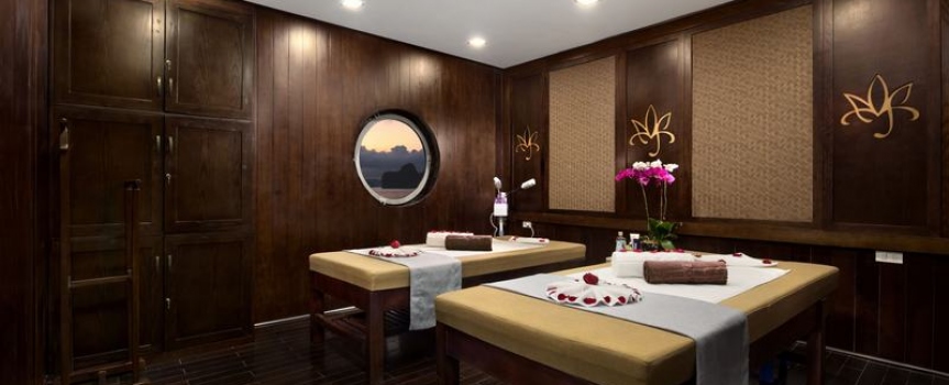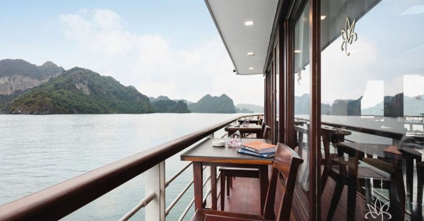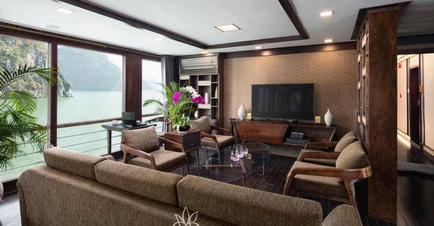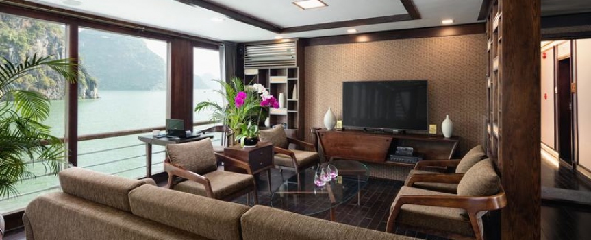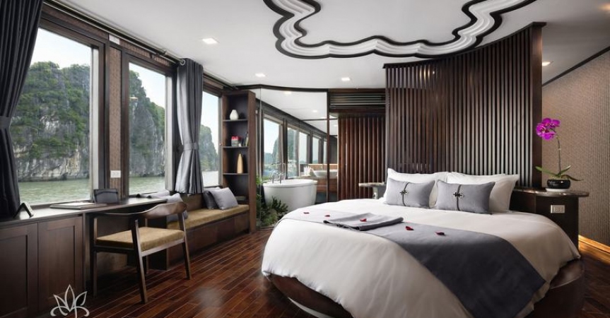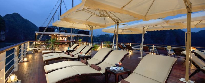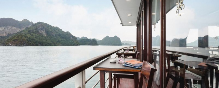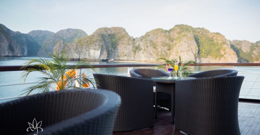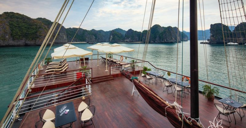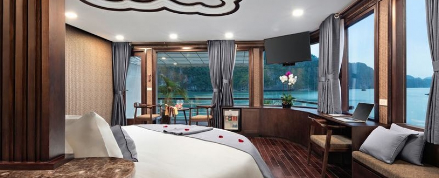 12h15: Quý khách lên tàu và làm thủ tục nhận phòng, thưởng thức bữa tiệc chào mừng; nghe thủy thủ và quản lý giới thiệu về tàu và hướng dẫn các quy tắc an toàn khi neo đậu tại phía Nam của vịnh Hạ Long, một trong “7 kì quan thiên nhiên mới” của thế giới. Vịnh Hạ Long vẫn luôn giữ được nét văn hóa từ hàng trăm năm qua, cùng nét đẹp qua nhiều thế kỉ với những vùng biển tuyệt đẹp và hàng trăm ngàn đảo đá ấn tượng.