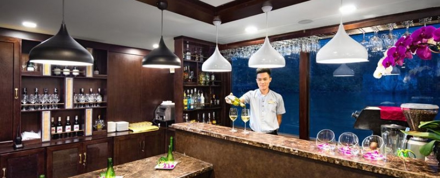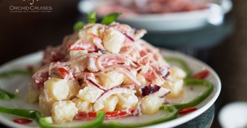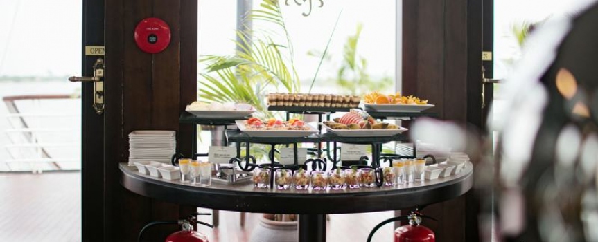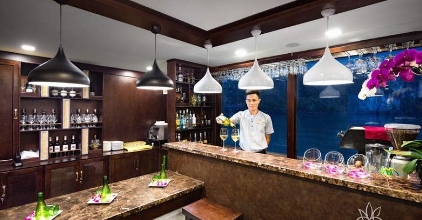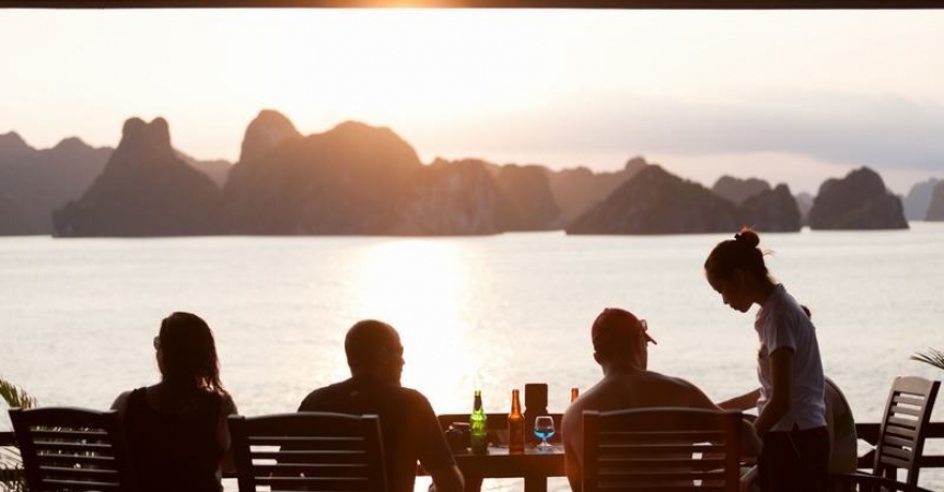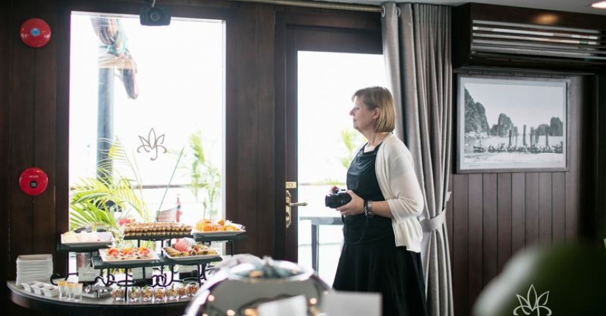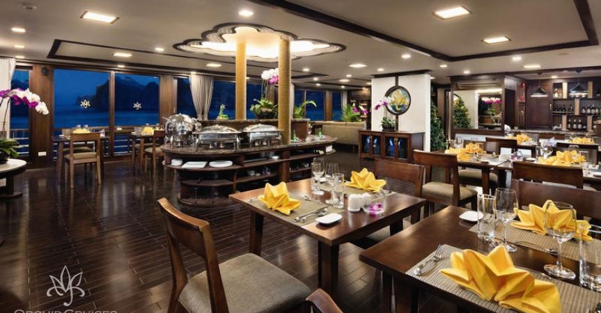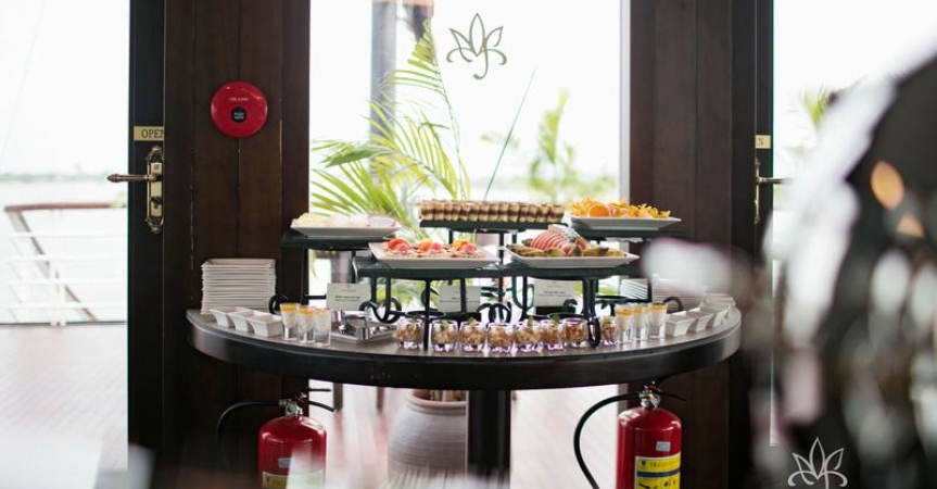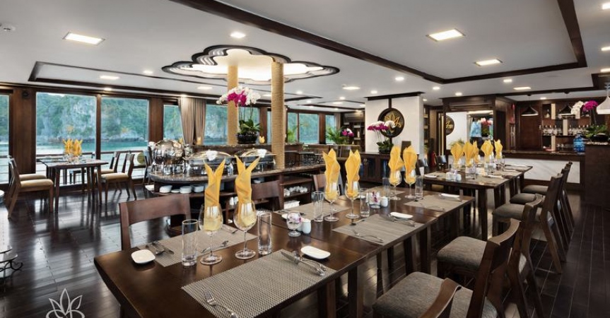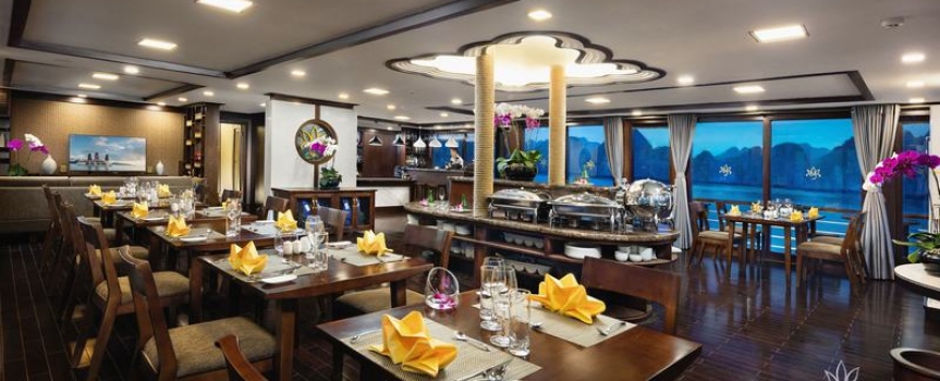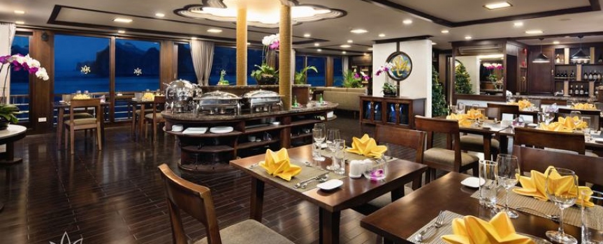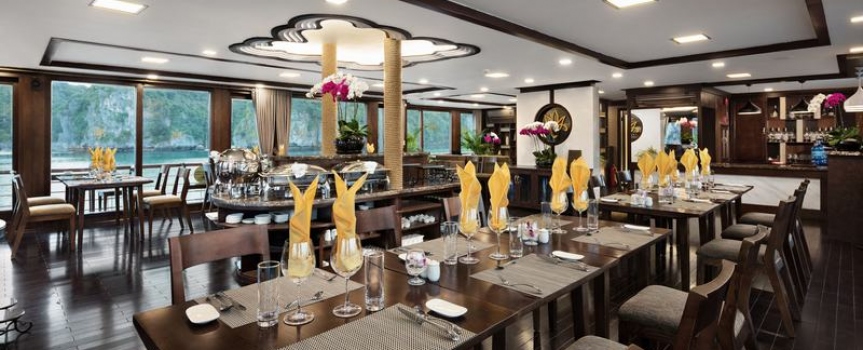 19h30: Thưởng thức bữa tối với các loại đặc sản địa phương được chuẩn bị và phục vụ bởi đội ngũ nhân viên chuyên nghiệp của tàu.