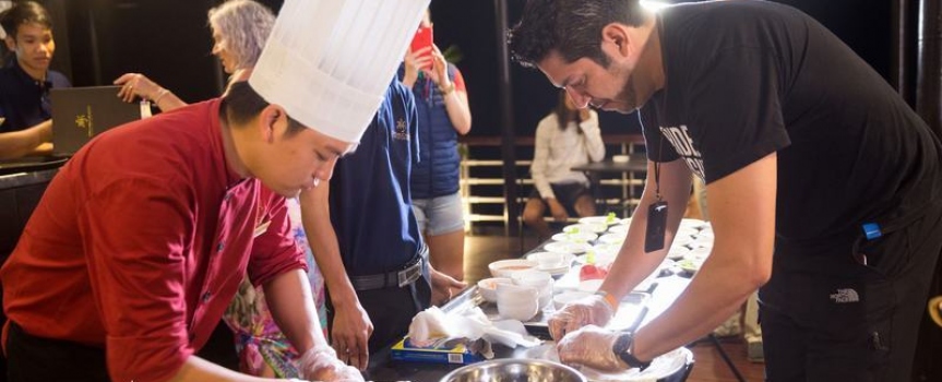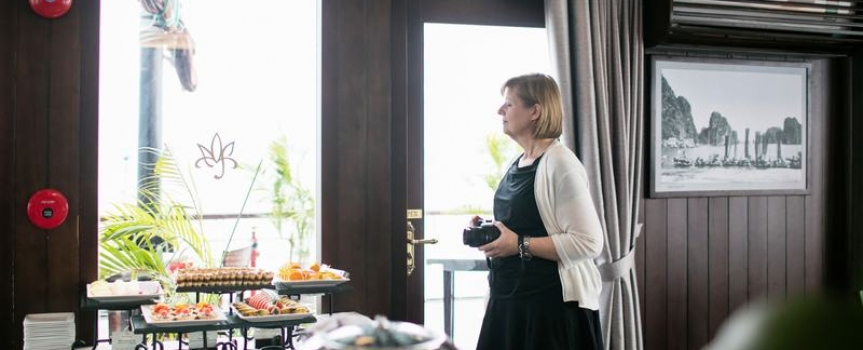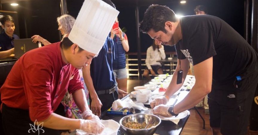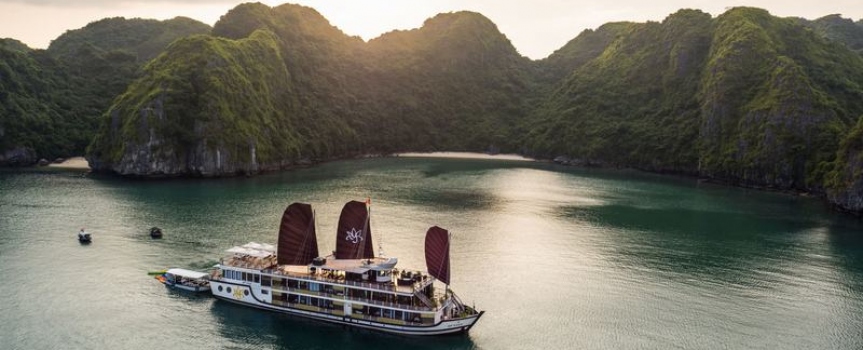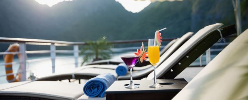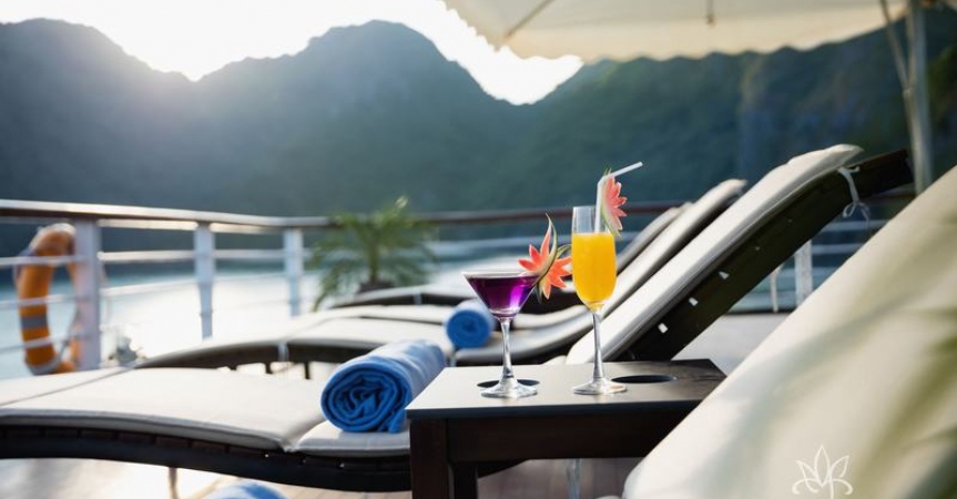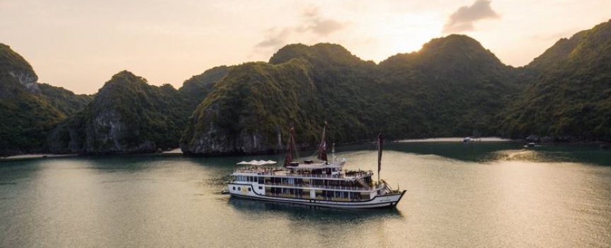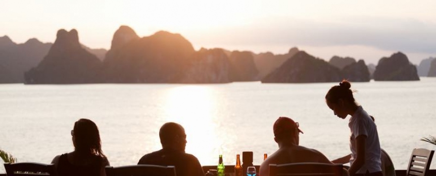 17h45: Quay trở lại tàu, quý khách có thể ngắm cảnh hoàng hôn tuyệt đẹp trên vịnh Bắc Bộ. Tham gia một lớp học nấu ăn truyền thống trên tàu từ những vị đầu bếp chuyên nghiệp của chúng tôi và thử nấu các món ăn theo phong cách Việt Nam. Đầu chiều tối sẽ có bữa ăn Happy Hour được phục vụ trên tàu.
