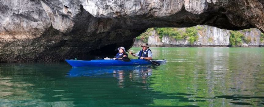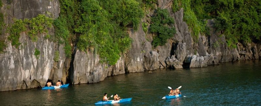 Du khách sẽ chèo thuyền kayak, hoặc bơi, đây sẽ là một trải nghiệm tuyệt vời khi được đắm mình trong làn nước trong xanh như pha lê của vịnh tại hòn Ba Trái Đào ( chương trình áp dụng từ giữa tháng 4 tới tháng 11 )