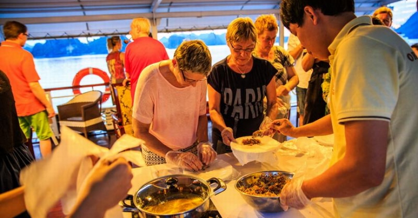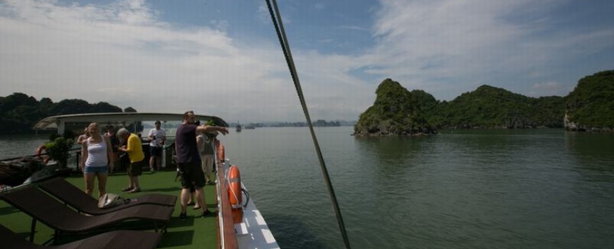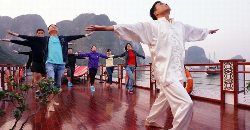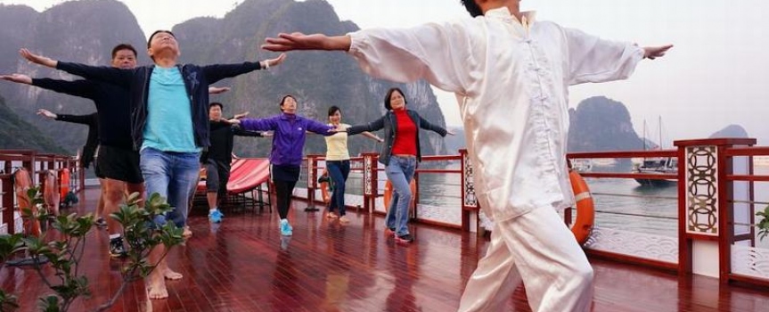 Tập Tai-chi, tuỳ theo ý thích của mỗi người mà du khách có thể tham gia tập hoặc chỉ đơn giản là thức dậy sớm có thể ngắm cảnh vịnh về buổi sáng. Ngồi trên boong tàu phía trước, thưởng thức cảnh đẹp của những dãy đá nhô lên từ mặt nước. Không gian tĩnh mịch.