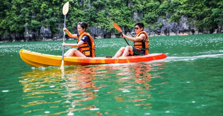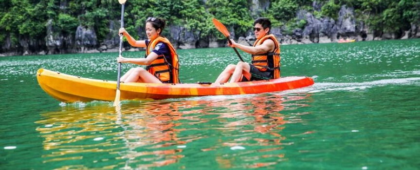 Quý khách sau khi được đưa ra vịnh Lan Hạ sẽ chèo kayak thăm cảnh vịnh, đi vào những hang nước khác vô cùng thú vị.