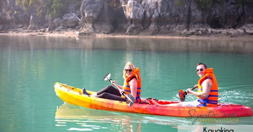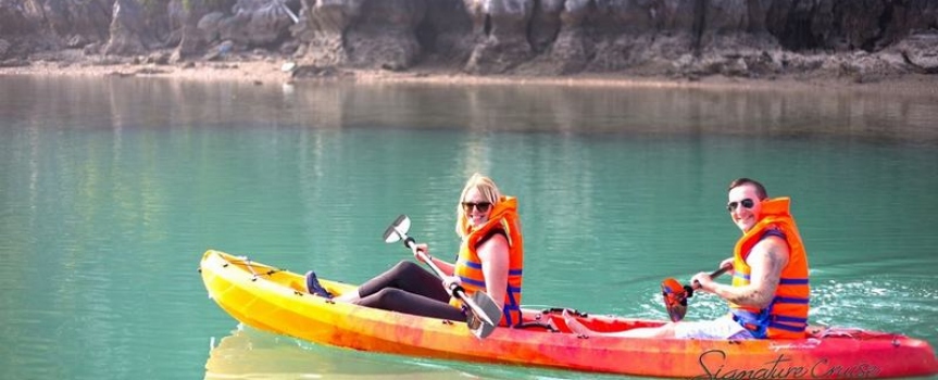 14.00 Sau bữa trưa, Đoàn tiếp tục tiến về khu vực tách biệt nhất của vịnh Lan Hạ, khám phá hang Sáng, hang Tối. Tại đây, Quý khách có thể chèo thuyền kayak tự khám phá làng chài xung quanh hoặc các đảo đá bí ẩn khác (phí kayak tự túc).