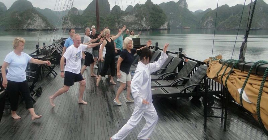 06.00 Quý khách dậy sớm ngắm bình minh trên biển, thưởng thức không khí trong lành tự nhiên của biển cả, tham gia bài tập Thái Cực Quyền cho ngày mới tràn đầy năng lượng cho các hoạt động tham quan trên Vịnh.