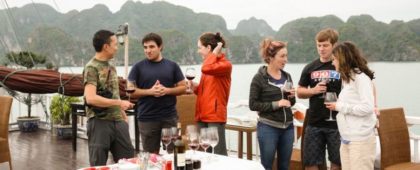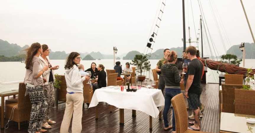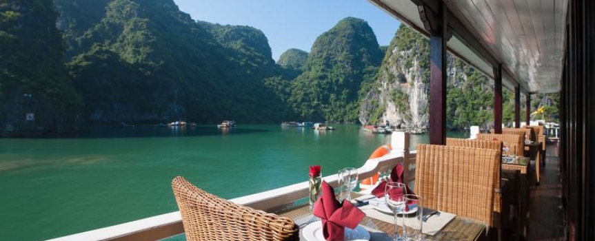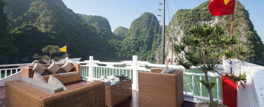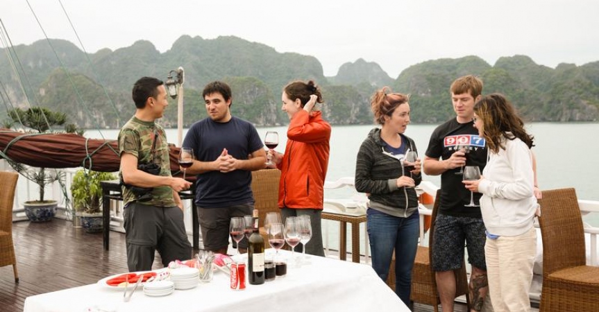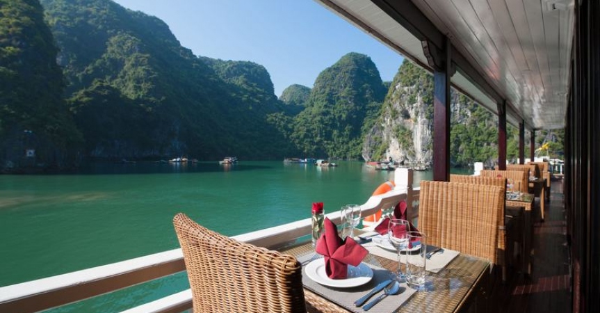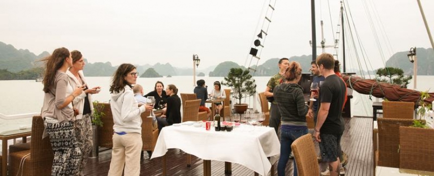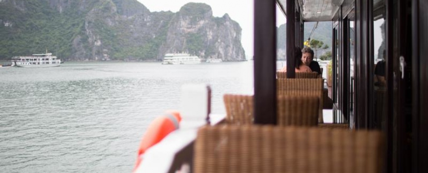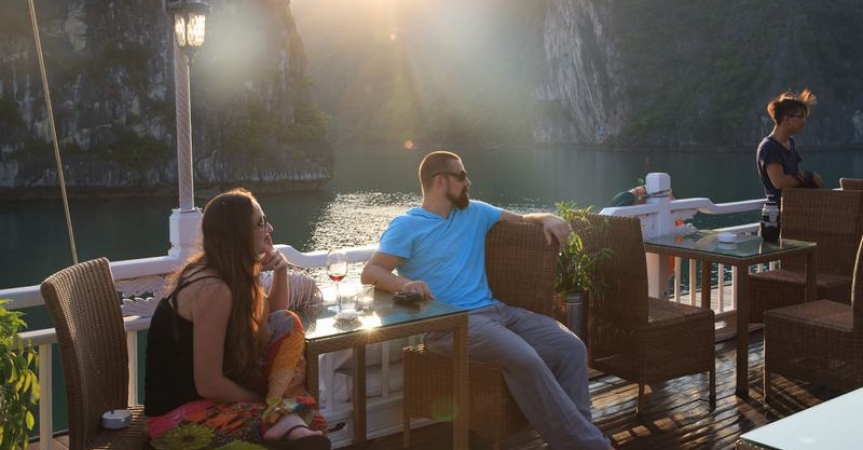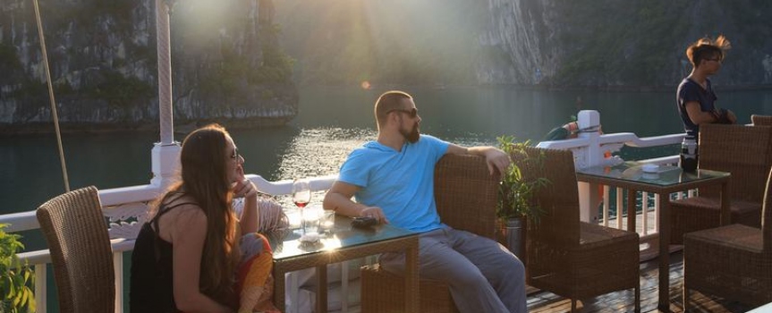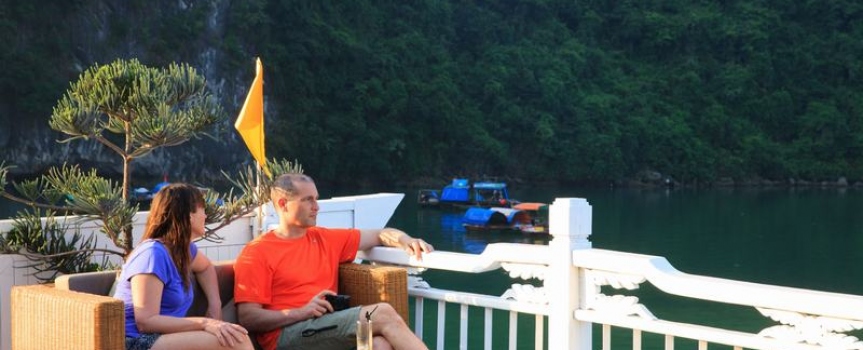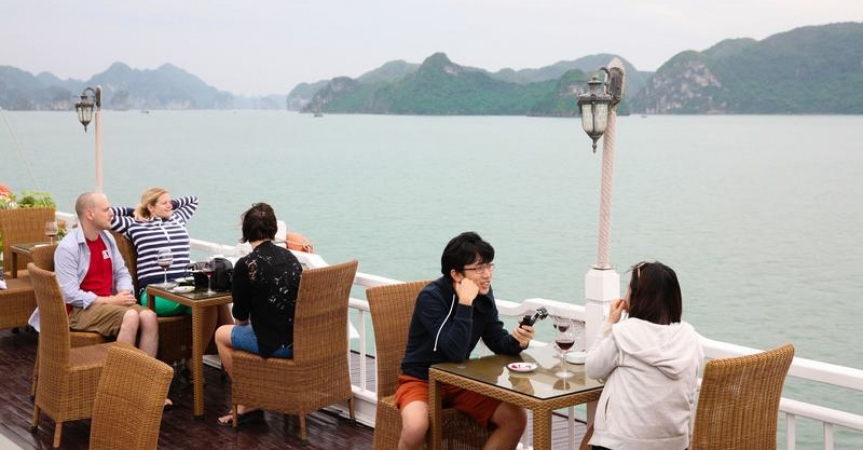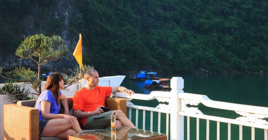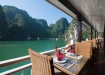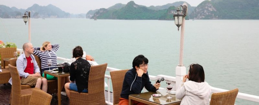 10:30 Quý Khách thư giãn trên boong tàu hoặc trong phòng ăn, đắm mình trong cảnh thiên nhiên tuyệt vời trên vịnh.