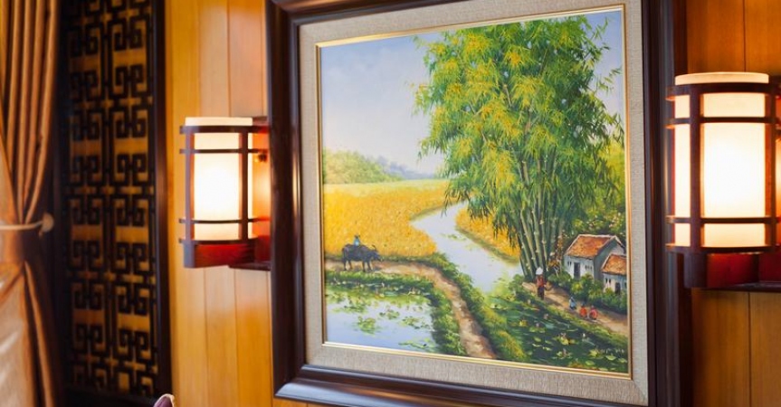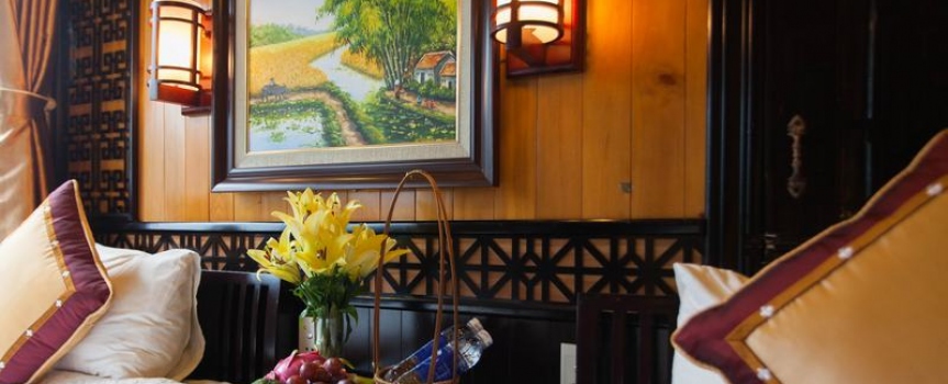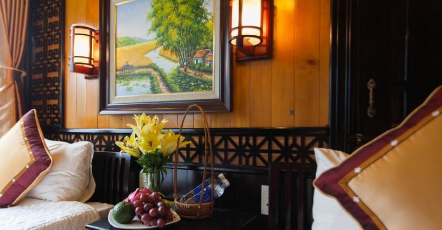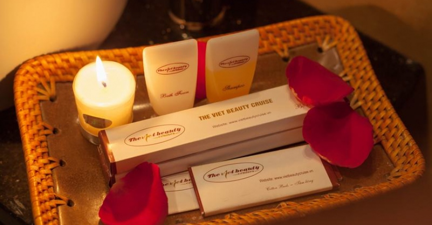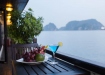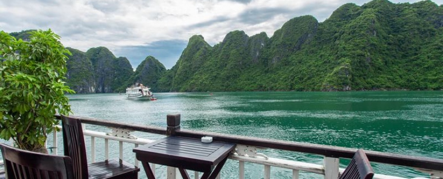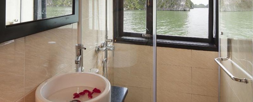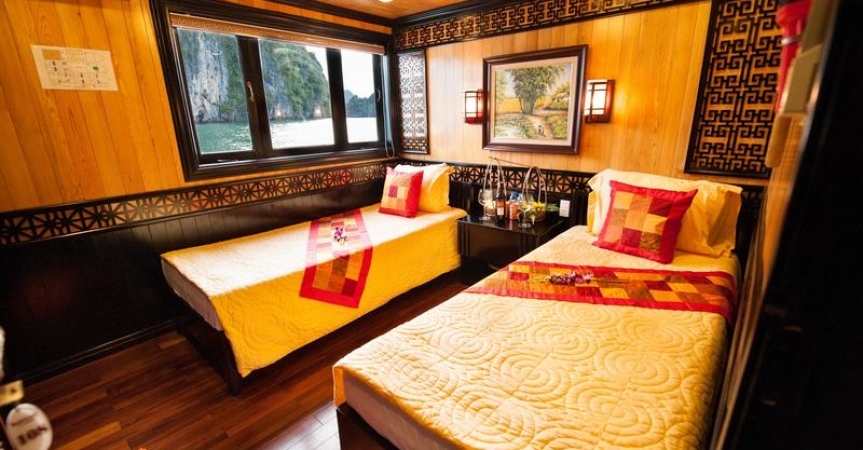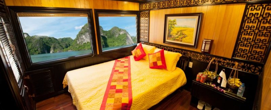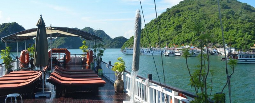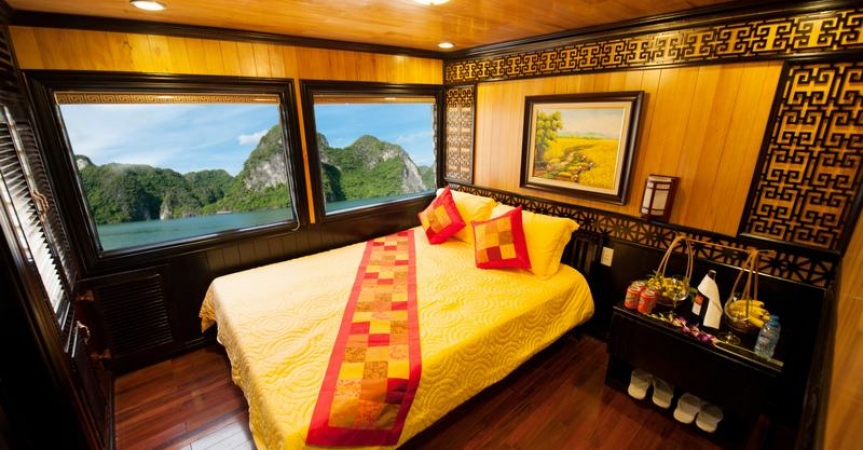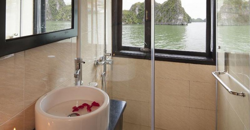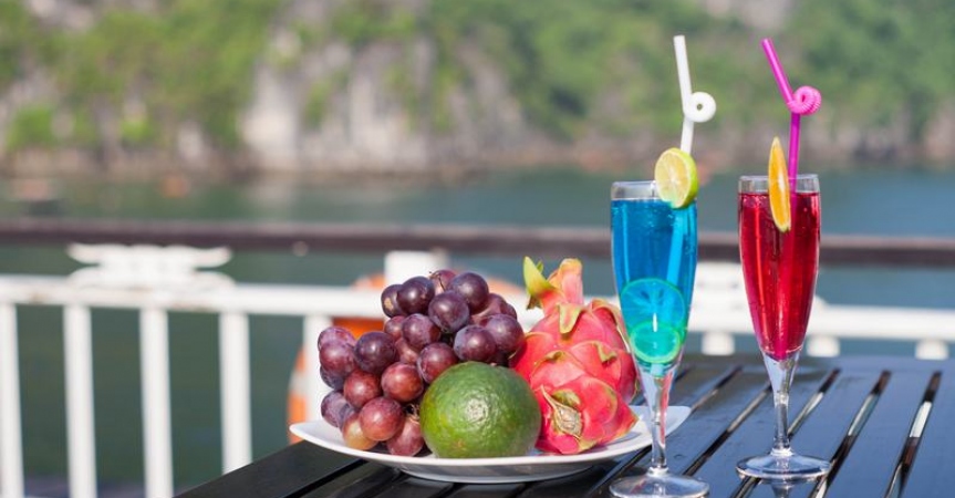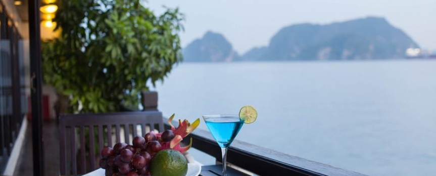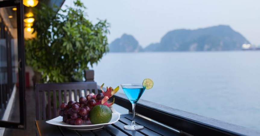Lên thuyền, nhân viên tàu chào đón quý khách bằng ly nước mát. Trên thuyền quý khách cũng được miễn phí truy cập Wifi. Quý khách nhận phòng tàu và ăn trưa ở trên tàu trong khi tàu đi ngang qua Hòn Chó Đá, Gà Chọi…