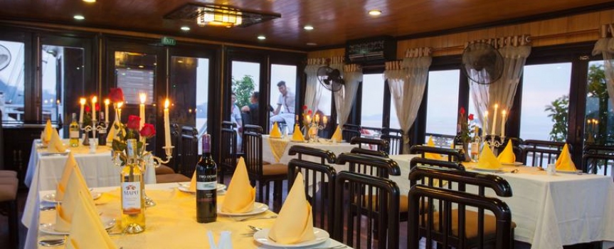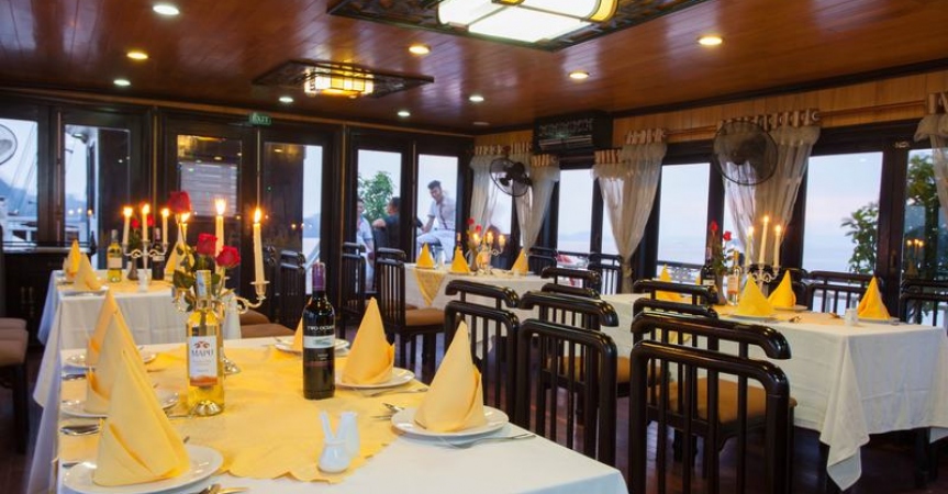 19:00 Ăn tối tại nhà hang trên tàu. Sau khi ăn tối xong, Quý khách nghỉ ngơi và tham gia một số họat động giải trí như hát karaoke, câu mực đêm hoặc massage nếu khách có nhu cầu.