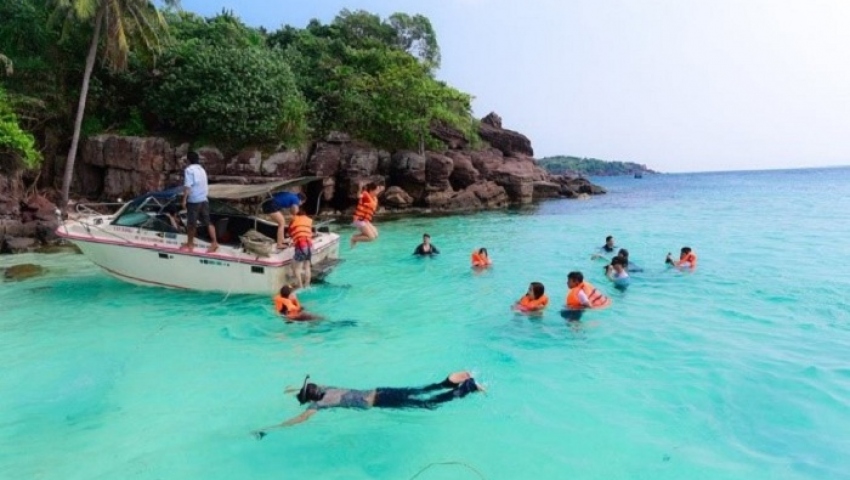 • Sau khi tắm biển và lặn ngắm san hô, quý khách dùng cơm trưa trên tàu, thực đơn gồm: Cơm trắng, trứng chiên, thịt gam (gà xào), canh rau củ (canh chua), cá chiên, trái cây tráng miệng. Dùng cơm trưa xong quý khách có thể nghỉ ngơi trên tàu, hoặc tiếp tục khám phá đảo hoang, chụp hình lưu niệm, tắm biển