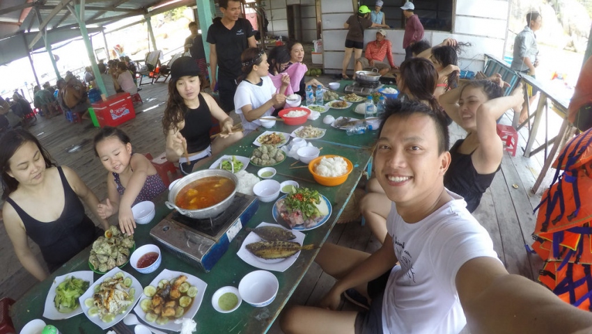 Buổi trưa: xe điện đưa khách ra bè tôm dùng bữa trưa với các món hải sản đặc sắc của Hòn Đảo.