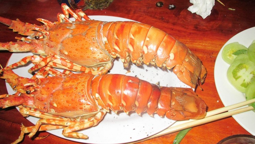 Đến với đảo Tôm Hùm: Hướng dẫn viên đưa đi tham quan chụp hình, Bót Cửa ngắm toàn cảnh biển tuyệt đẹp Vịnh Cam Ranh, lô cốt của Pháp xây cuối thế kỉ 19.Tham quan Bãi Chướng trải dài những hoa rau muống biển và hoa cỏ may rất đẹp, dạo quanh núi Hòn Cò nhìn biển xa tít mênh mông.Du khách có thể tham quan 2 ngôi chùa như Điện Địa Tạng: một trong những nơi thờ Địa Tạng Vương Bồ Tát được những phật tử hảo tâm lập nên.