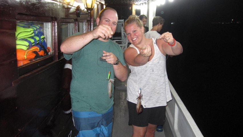 Khi đến khu vực câu mực, đèn sẽ được bật sáng, quý khách nhận dụng cụ câu mực. Hdv sẽ hướng dẫn cho quý khách cách câu mực và sau đó là màn trổ tài để bắt được những con mực to nhất, chiến lợi phẩm thu được các bạn có thể yêu cầu chế biến để thưởng thức trong bữa tối trên tàu (đã bao gồm trong giá tour).