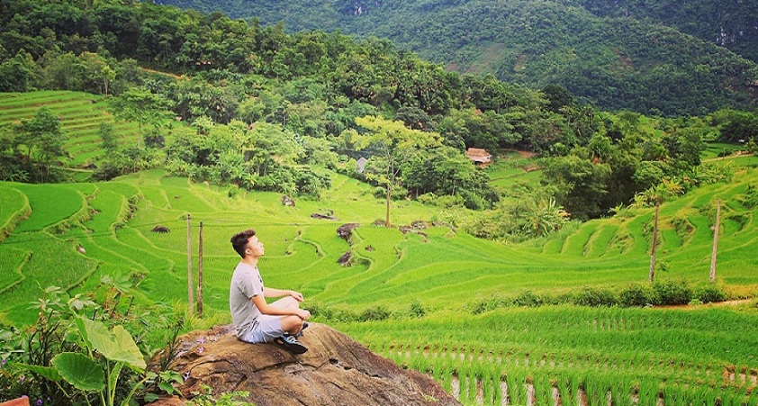 14h30: Đến Pù Luông. Quý khách bắt đầu hành trình đi bộ khoảng 1km đến bản Kho Mường – một bản vùng cao với những cảnh đẹp ngoạn mục, đặc biệt là vào mùa lúa chín vàng ươm trên những sườn đồi uốn lượn. Tùy thuộc vào sức khỏe của mỗi người, khi đến với khu bảo tồn thiên nhiên Pù Luông, với các bản làng của người Thái, người Mường, Quý khách có thể leo núi và khám phá hang động tại Pù Luông do nhiều bản không có đường đi nên treking là một cách khám phá phong cảnh tuyệt vời nơi đây.